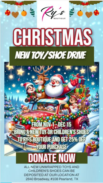 Join us in spreading holiday cheer! 🎅 From November 1st to December 15th, bring a new toy or a pair of children’s shoes to Ry’s Boutique and receive 25% off your purchase.